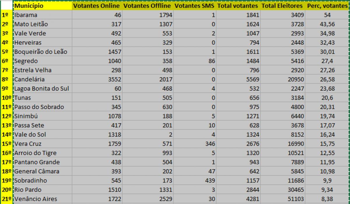Em 2017 foram 39.028 eleitores que votaram na Consulta Popular, contra 41.579 em 2018. Os votos pelas plataformas online pelo site contabilizaram 23.406 votos, 17.103 pelo sistema off-line. O município com maior número de votos foi Santa Cruz do Sul, com 6.151 votos e percentual de 6,26% do total de eleitores (o índice mais baixo entre todos os 23 municípios). Já Lagoa Bonita do Sul registrou 517 votos (23,68% do total de eleitores do município). Mato Leitão registou o maior percentual de votos entre o total de eleitores (43,56% e 1.624 votos).